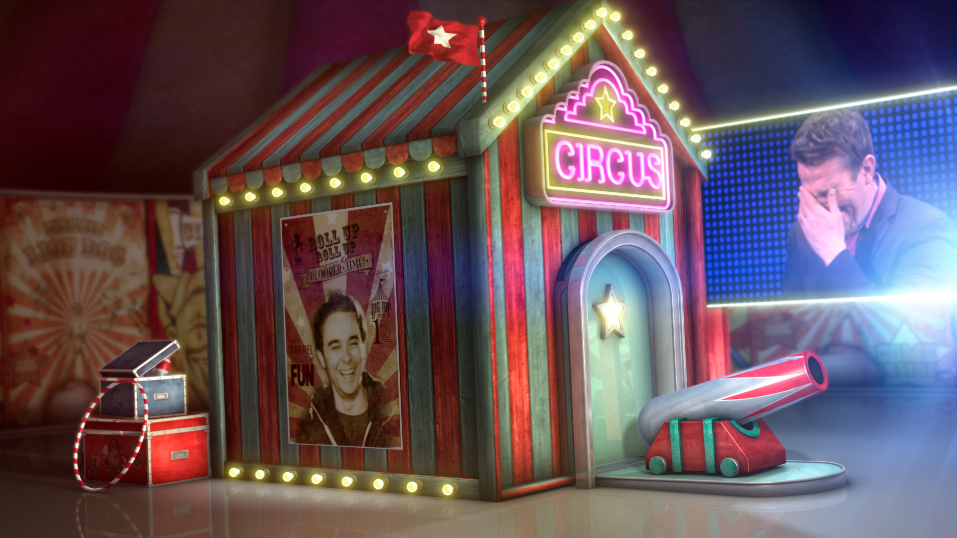 To work with the tradition of the show where things are seen going wrong, we created the new title sequence based around the theme of a Circus. As we travel on a journey in a seamless camera move, we encounter a number of circus themed stunts happening or going wrong, combined with the reactive celebrity clips as featured in the show. TITLE SEQUENCE | 3D ANIMATION | 2D EFFECTS